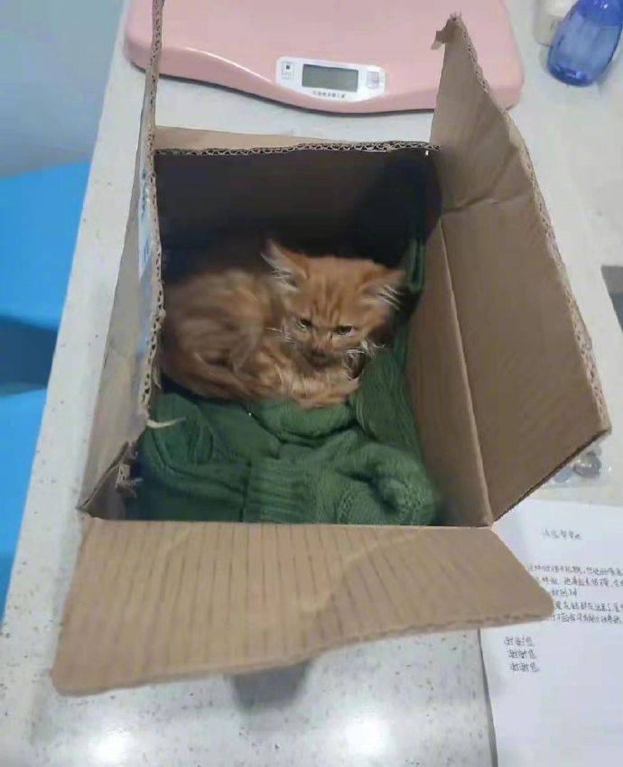 事件发生在中国昆明市的春雨宠物医院,张医师早上开门时,发现门口多了一隻窝在纸箱裡的小橘猫,裡面还有一件绿色毛线衣,原以为又是无良人士弃养动物,却在箱内发现了一张纸条!