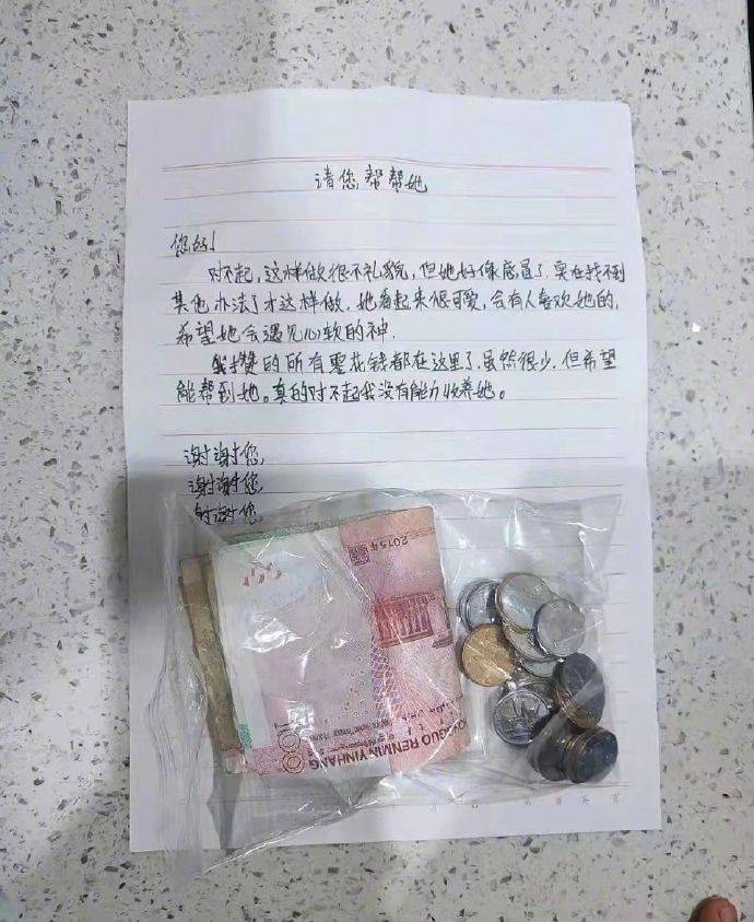 小朋友随信附上了一小袋的钱,有皱巴巴的纸钞和不同面额的硬币,並写道「我攒的所有零用钱都在这裡了,虽然很少,但希望能帮到她,真的对不起我没有能力收养她」,最後连续写了三次谢谢您。