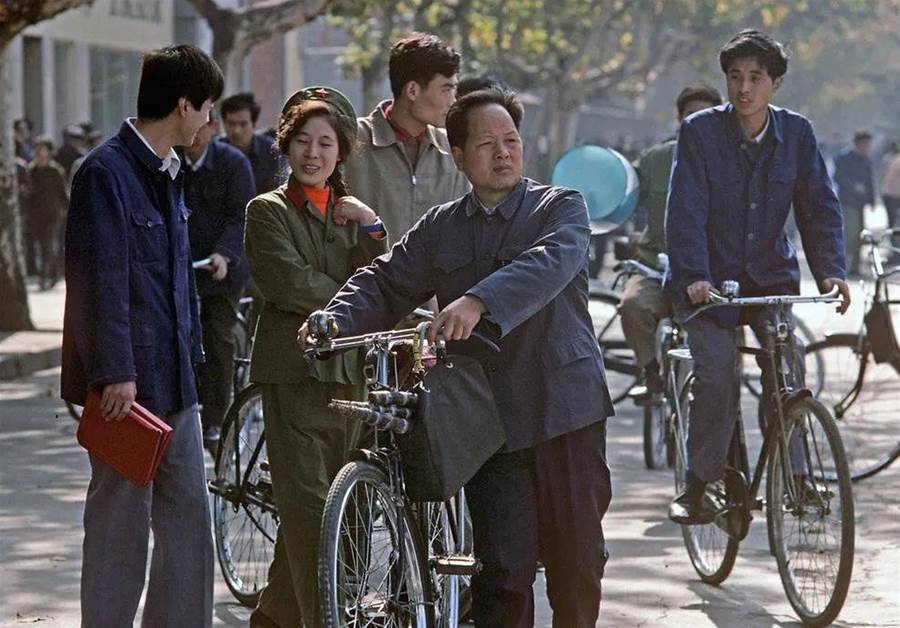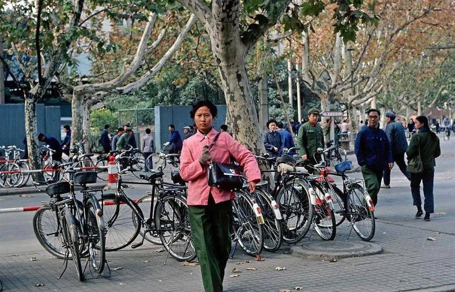 1979年,南京街景。路邊擺放了一排排的腳踏車,那時候城市的大街小巷隨處可見腳踏車。迎面走來的那位女士,穿著在當時應該算得上是很時髦的了,粉色的上衣,讓其在人群中就格外顯眼。