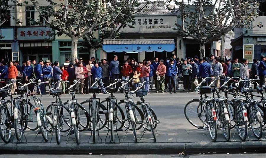 1979年,南京街景。路上整齊停放了一排的腳踏車。梧桐樹下等公共汽車的市民排起了長隊。這個地方有多少人,能認出是昔日南京的什麼地方?