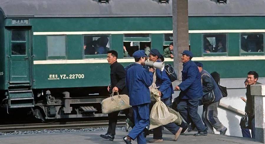 1979年,南京火車站站台上。停靠在站台上的火車即將發車,車站工作人員拿著大喇叭通知乘客,扛著大包小包的旅客們正匆忙地趕著上車。昔日綠皮火車,在火車站很常見,很多人有很多難忘記憶,隨著鐵路事業的發展,如今綠皮火車離我們越來越遠。