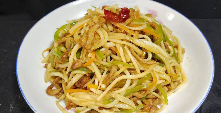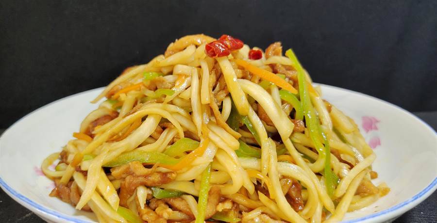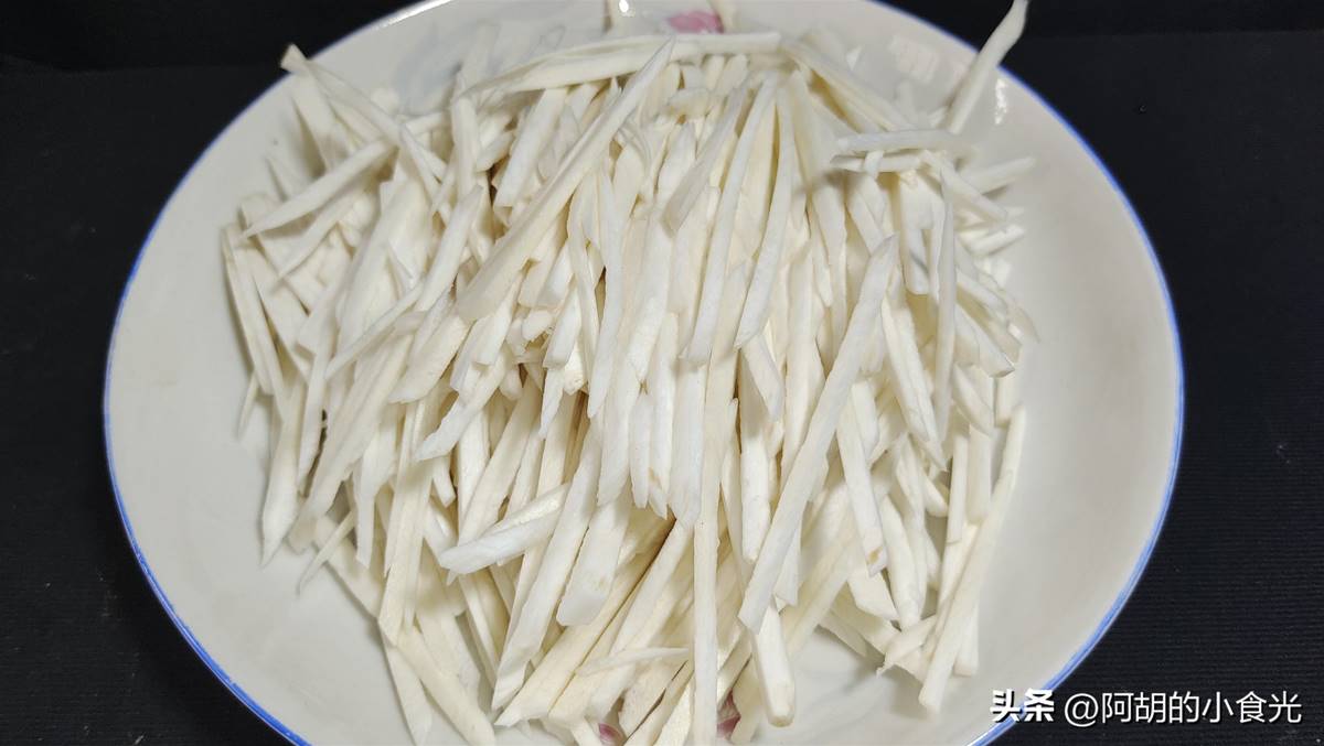 第一步:準備茭白三個,拔去外殼后露出白色的肉,而后再用削皮刀在上面削幾下,削去一層老皮,如此可以讓茭白口感更好,再切成稍微粗一點的茭白絲備用。將茭白絲下鍋焯燙30秒鐘,如此可以去除茭白中的草酸,撈出后立刻投入涼水中充分冷卻,撈出后控干水份備用。