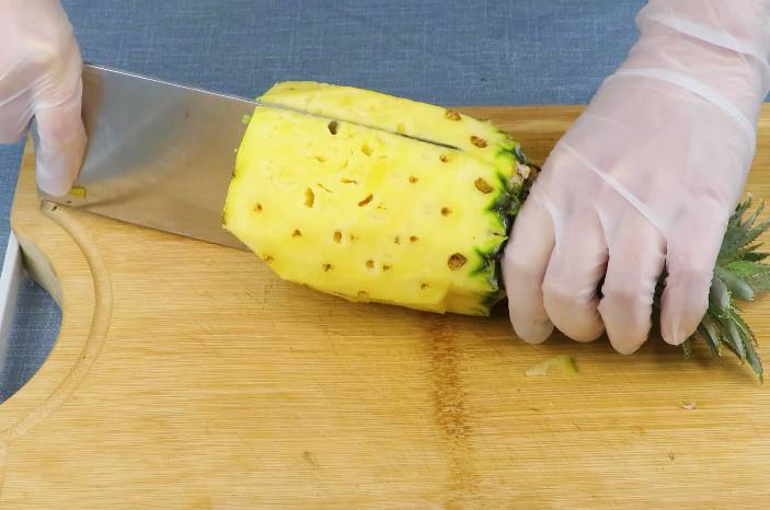 戴上一次性手套,一只手拿着菠萝头上的叶子,这里要注意,在切菠萝时,不要把菠萝头上的叶子切掉,然后用刀切成差不多大小的4份菠萝,然后再把菠萝切成小块就可以了。