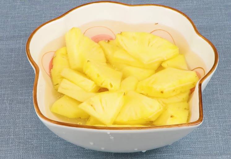 切好菠萝之后就是吃菠萝了,切好菠萝之后,先用盐水浸泡再吃。