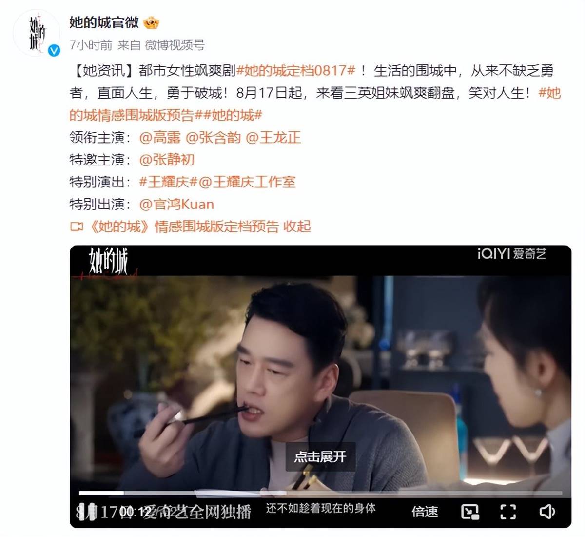 8月15日,電視劇《她的城》官宣定檔,8月17日起,愛奇藝獨家上線開播。這部電視劇的陣容官宣內容如下: