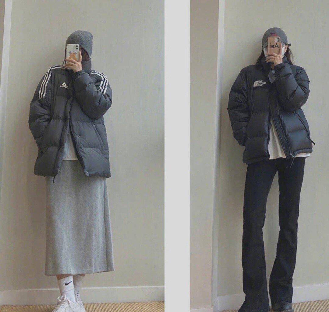 深灰色的羽絨服穿在身上,舒適又保暖,內搭一件白色的上衣時尚,下半身則是灰色半身裙,盡顯休閑風格。