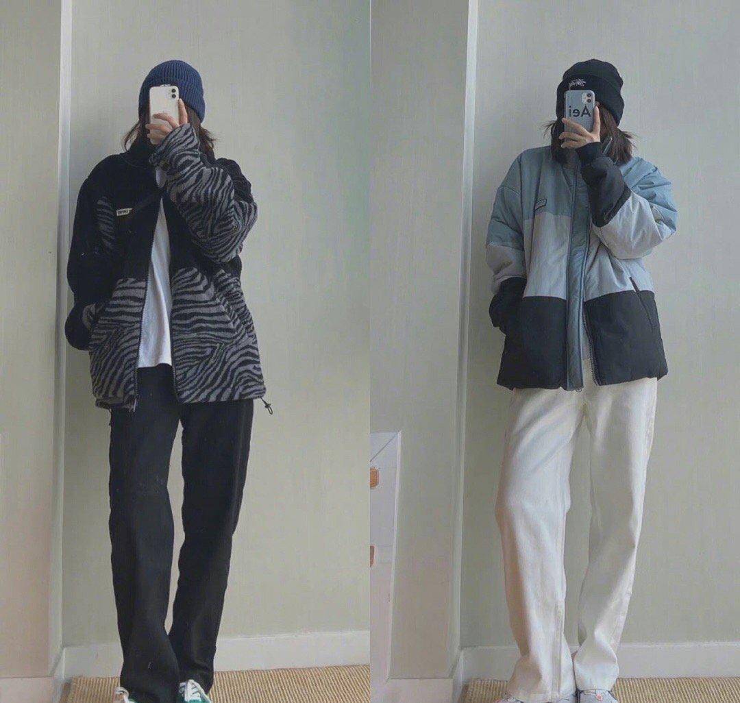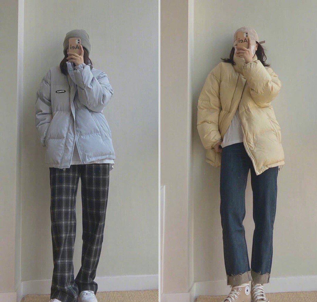 灰藍色的羽絨服外套穿在身上,簡約又高級,下半身搭配一條格子休閑褲,再戴上一頂灰色的針織帽,舒適簡約。