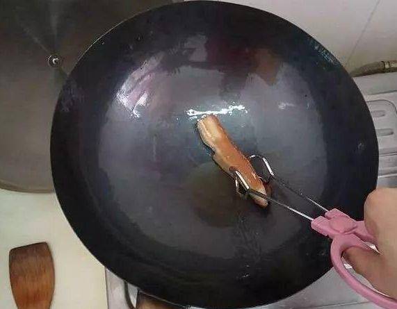 想要徹底的防止生銹和不粘鍋,開鍋的過程還沒有完成,還需要給鐵鍋涂上一層天然的保護膜,這和不銹鋼也是同樣的道理,只不過是環保無害的,老廚師告訴我,這也是一直以來的開鍋老辦法,用中小火加熱鍋,一邊加熱一邊轉動,讓鍋受熱均勻,等鍋底變成藍灰色的時候,用一塊肥肉均勻的涂抹整個鐵鍋,然后關火放置一天的時間,最后用熱水沖洗就行。