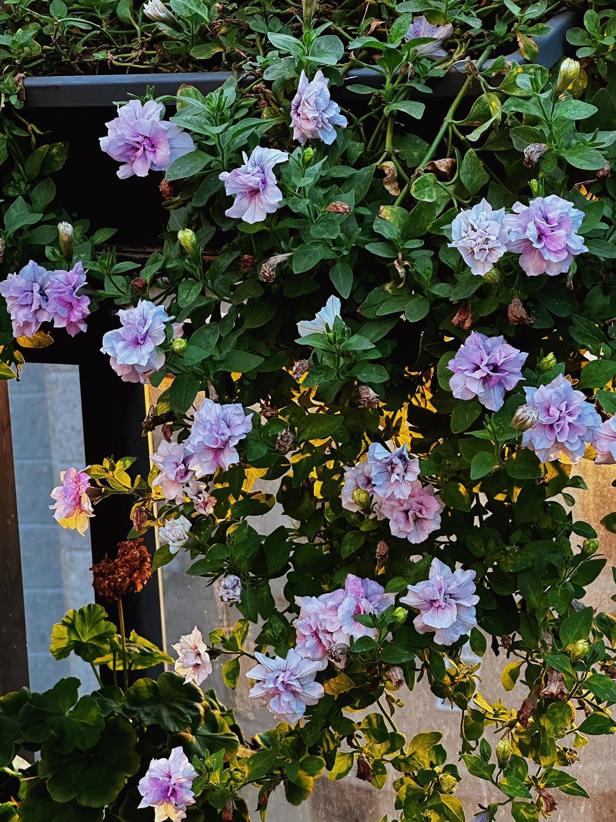重瓣矮牽牛冰淡紫開得熱鬧。前段時間有次忘澆水,對植株損傷很大,但很快就緩過來了,無懼盛開,冰涼美艷。