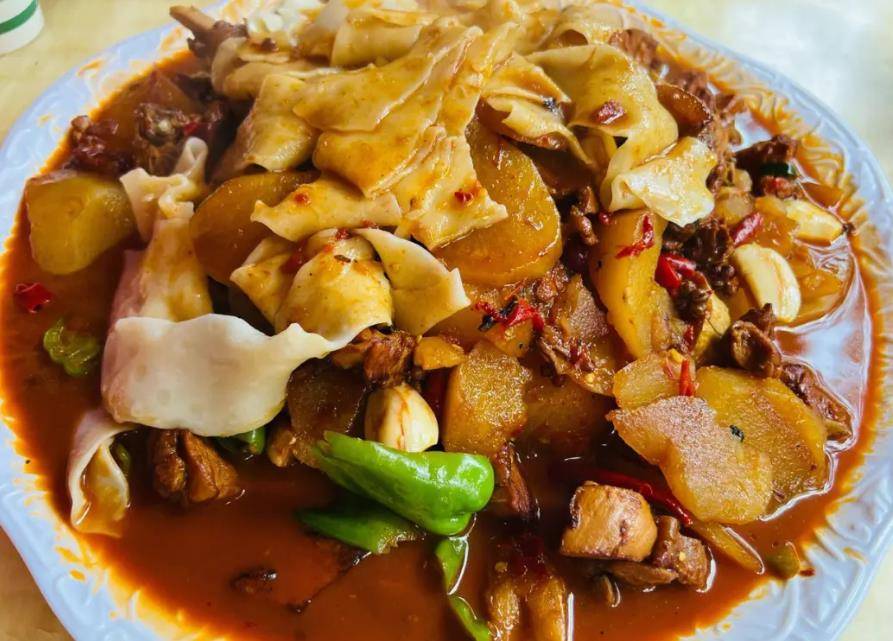 燉煮時加入干紅椒、蔥段等調料,時間根據雞肉大小調整,最后放入土豆、青椒等輔料。成品呈現醬紅色,配有紅椒、土豆和青椒的色彩搭配。味道微甜,辣中帶麻,肉質柔嫩。通常搭配皮帶面一起食用,皮帶面是寬度約1-4厘米,長度約20-50厘米的面條片。新疆大盤雞可作為主食或下酒菜食用。