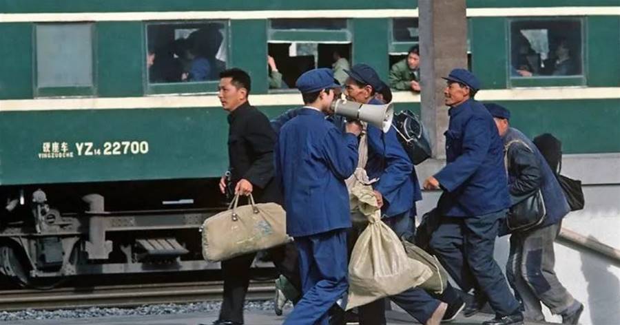 1979年,南京火車站站台上。停靠在站台上的火車即將發車,車站工作人員拿著大喇叭通知乘客,扛著大包小包的旅客們正匆忙地趕著上車。昔日綠皮火車,在火車站很常見,很多人有很多難忘記憶,隨著鐵路事業的發展,如今綠皮火車離我們越來越遠。