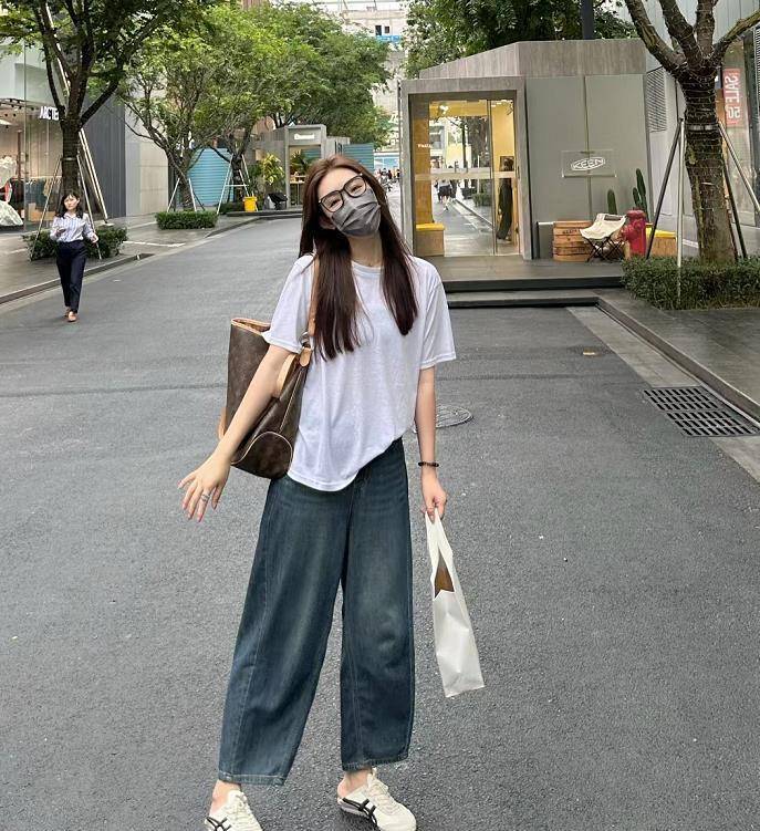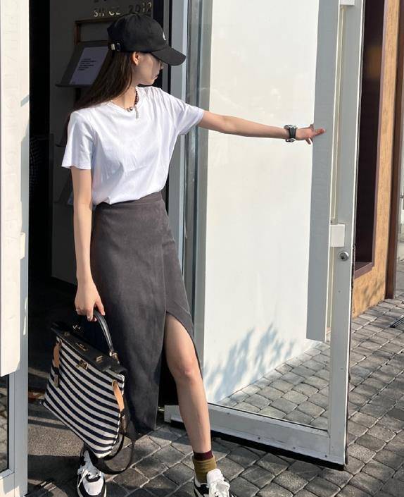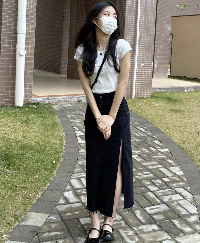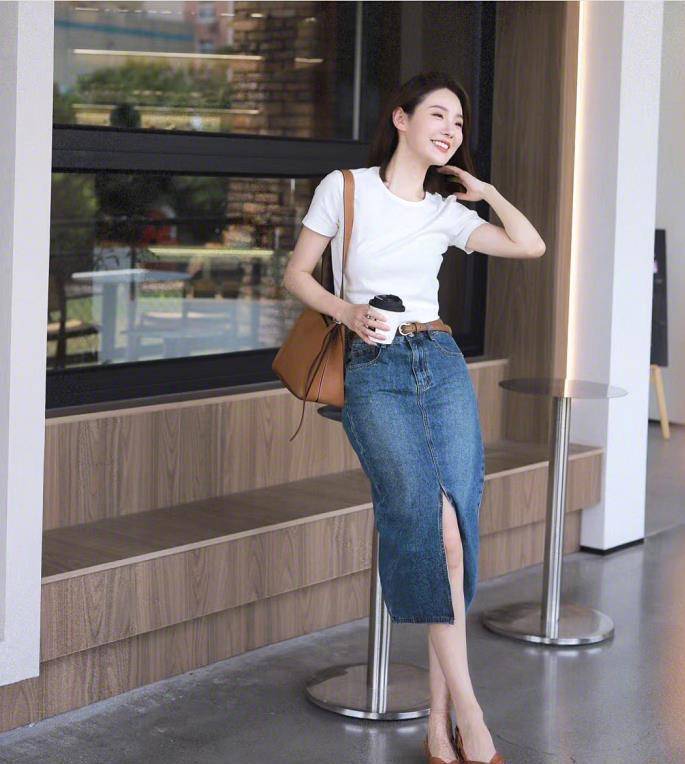 上身較胖的姐妹不建議穿修身的白色T恤。直筒開叉牛仔裙不僅拉長腿部線條,還提高腰線。年輕的姐妹或某個年齡段的人都可以穿這種類型的衣服。