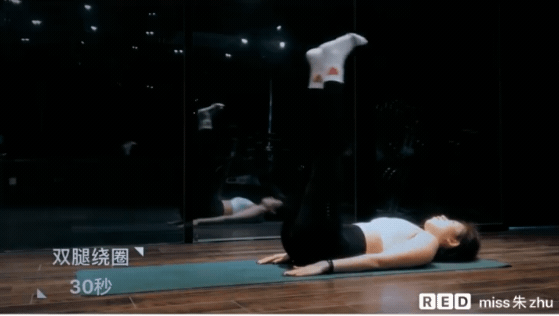 第二招「双腿绕圈」,先是平躺在上,双手伸直放在身体两侧,掌心贴地面,双腿打直抬高,到与地面呈现90度,再往外划圈圈,一样一组30秒。