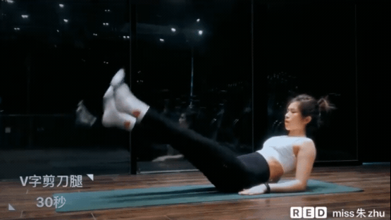 第四个动作是神似第一个动作的「V字剪刀腿」,上半身微挺直,腰部以上都不要碰到地面,只有双手放在身体两侧贴地,接着双脚伸直,上下摆动呈现剪刀状,一组30秒。