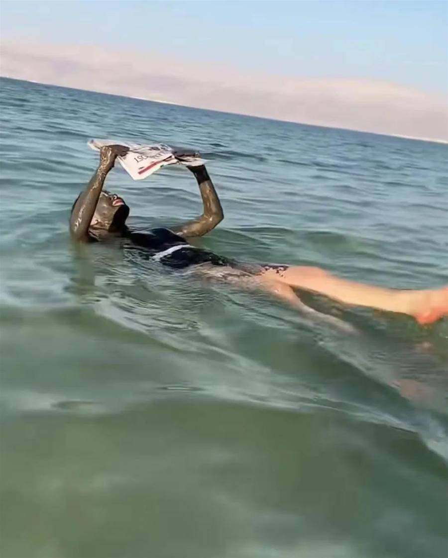 王小騫還為我們展現了死海不會游泳也不會沉底的神秘之處,只見她拿著報紙漂浮在海面上,看起來十分愜意。