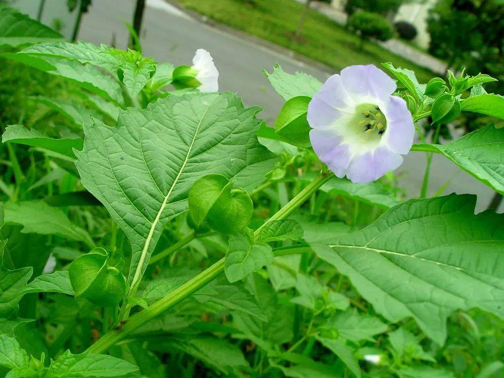 種植物它的名字叫假酸漿,也叫燈籠果。一般在每年的夏秋季節開始開花結果,花就長在這個枝腋的位置,它花冠呈鐘型,淺藍色,漿果球狀,黃色。種子淡褐色。果實可吃。
