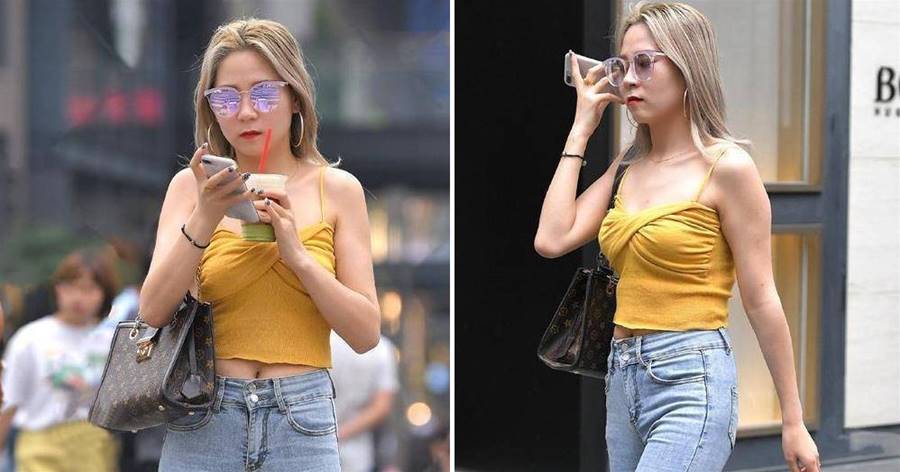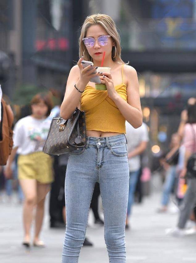 美麗的上身穿一件鵝黃色的吊帶T恤,吊帶也是女生很喜歡的時尚單品,既可以單穿,也可以內搭。