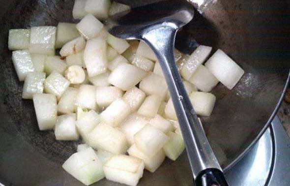 接著,將冬瓜去皮,切成片或者塊狀都可以,切好后放入盤中備用。接著,將蔥、姜、蒜切末備用。在鍋中加入適量的油,將蔥、姜、蒜末炒香,然后加入豆瓣醬翻炒,炒出紅油后加入適量的生抽和老抽,再加入適量的水,燒開后加入冬瓜塊,轉中小火慢燉約10分鐘,讓冬瓜充分吸收調料的味道。