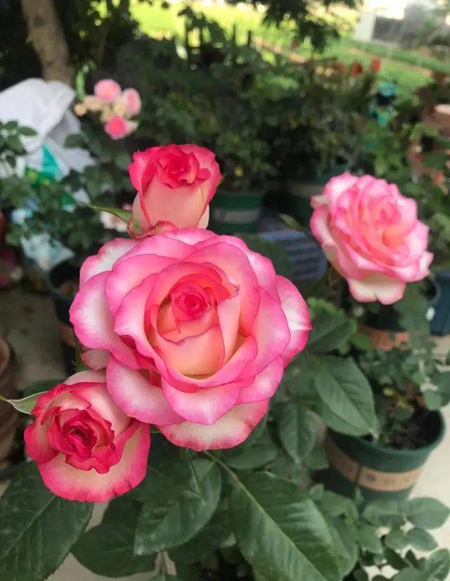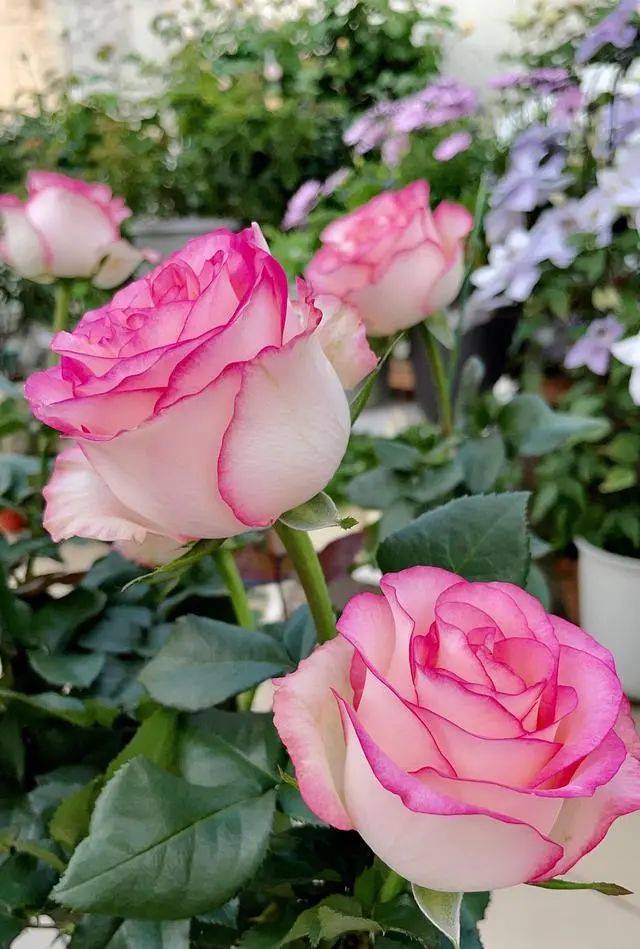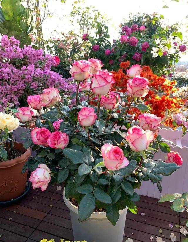 朱米莉亞屬于小型灌木月季,株高最多只能長到1米這樣,株型非常直立,分枝性一般,需要經常打頂才會長出大量側芽,通過修剪可以讓樹形變得緊湊圓潤,身上刺不多,只有零星幾根,不用擔心會扎手,最初是用來專門做切花的,後來發現做庭院月季、盆栽觀賞效果也不錯,在陽台上也能養好,兩加侖以上的花盆就能滿足其生長需求,所以越來越多花友養它。