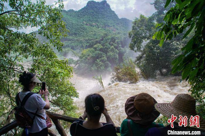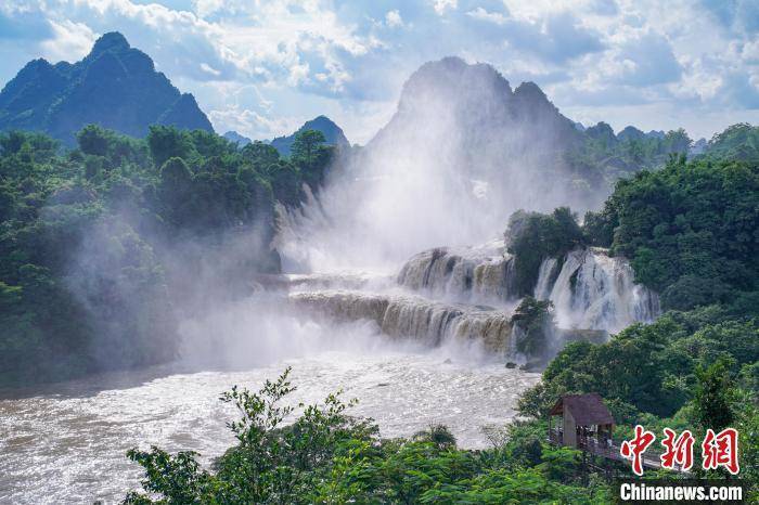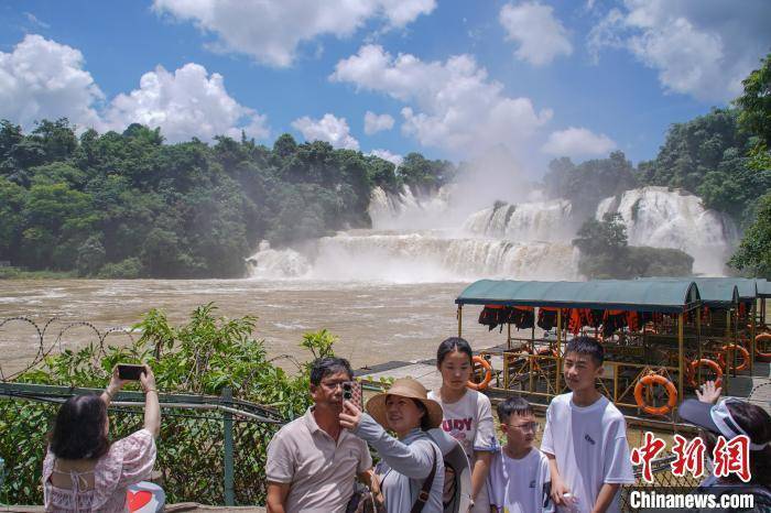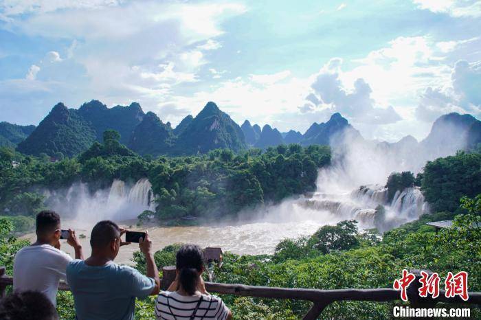 8月12日,廣西崇左市大新縣,豐水期的德天跨國瀑布景區迎來大批游客。德天跨國瀑布位于中國與越南邊境處的歸春河上游,與緊鄰的越南板約瀑布相連,是亞洲第一、世界第四大跨國瀑布。在該景區不僅可以欣賞到廣西的秀美山水,還能遠眺越南風光。近期由于上游來水量大增,德天跨國瀑布迎來豐水期,氣勢雄渾,場面壯觀。