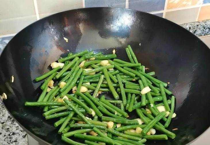 7. 加入豆角段,繼續翻炒,加入適量的生抽、老抽、白糖,翻炒均勻;