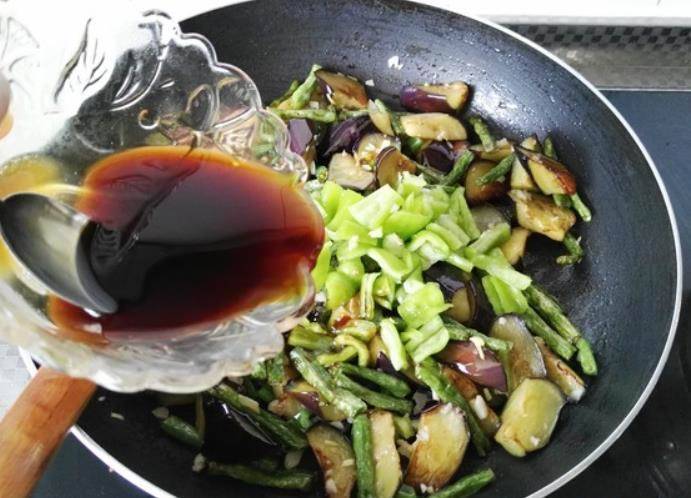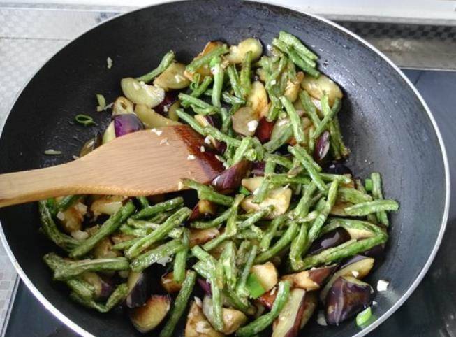 8. 倒入適量的清水,大火煮沸后轉小火,煮至豆角軟爛,茄子入味;