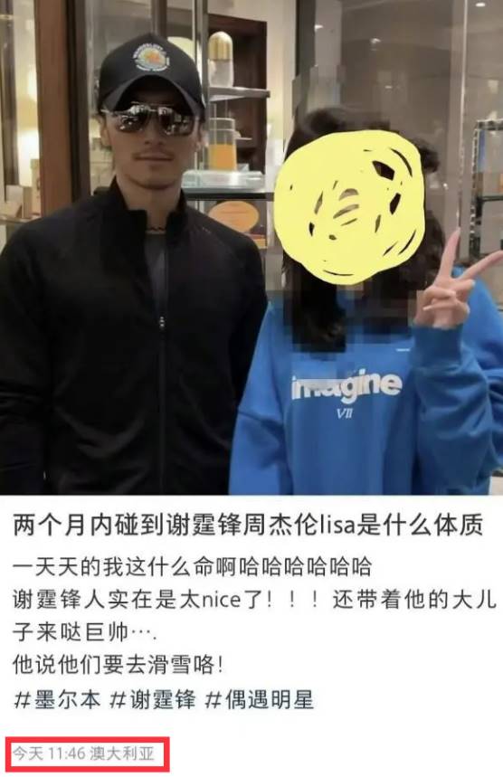 兩位粉絲都透露謝霆鋒是帶著兒子來澳洲度假,兩人還準備去滑雪。偶遇者夸贊謝霆鋒很nice,Lucas則「巨帥」。