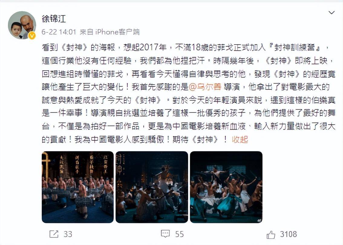 日前在微博留言为儿子打气,更大爆徐菲拍摄时还未满18岁:“看到《封神》的海报,想起2017年,不满18岁的菲戈正式加入‘封神训练营’,这个行业他没有任何经验,我们都为他捏把汗。时隔几年后,《封神》即将上映,回想进组时懵懂的菲戈,再看看今天懂得自律与思考的他,发现《封神》的经历竟让他产生了巨大的变化!我首先感谢的是乌尔善导演,他拿出了对电影最大的诚意与热爱成就了今天的《封神》。对于今天的年轻演员来说,遇到这样的伯乐真是一件幸事!导演亲自挑选并培养了这样一批优秀的孩子,为他们提供了最好的舞台,不仅是为了拍好一部作品,更是为中国电影培养新血液、输入新力量做出了很大的贡献!我为中国电影人感到骄傲!期待《封神》!”