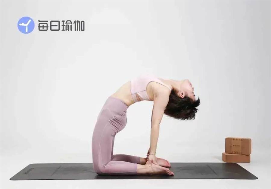 駱駝式:跪姿,雙腿略分開,腳趾指向后方。雙手放在髖部,向后彎曲。雙掌放在腳底之上,保持大腿垂直于地面,頭向后仰。