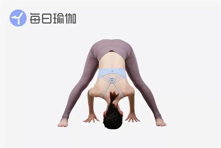 雙角式:挺身直立,兩腳微微分開,兩手垂于體側。兩手臂放在下背部,十指相交。上身自腰起向前彎,盡量把兩臂向頭的上方和后方伸展。