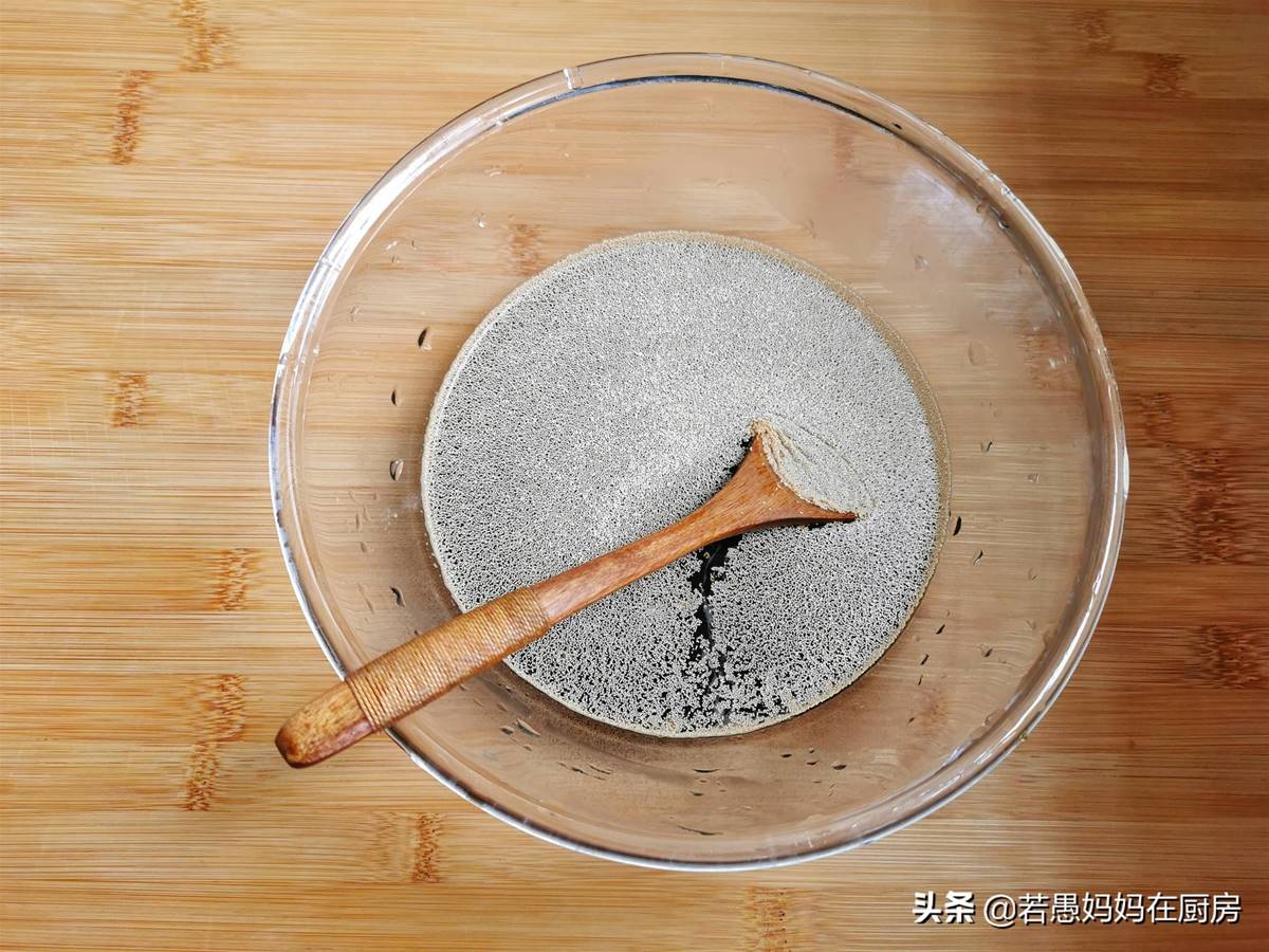 2、红糖水放置不烫手的温度时,倒入发酵粉,冬天气温低,可以多倒1克左右。