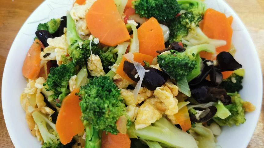 2、放西蘭花木耳、雞蛋翻炒➕1勺生抽➕1勺蠔油➕少許鹽和黑胡椒翻炒均勻出鍋