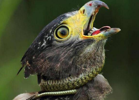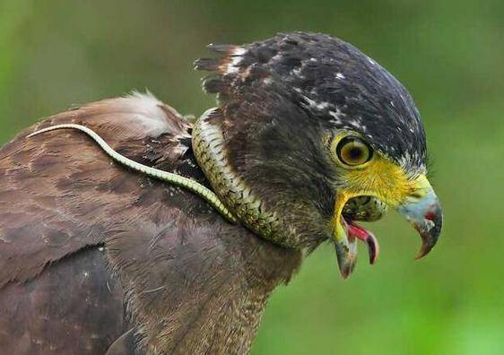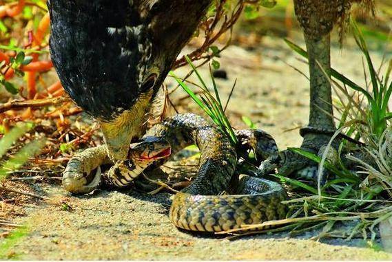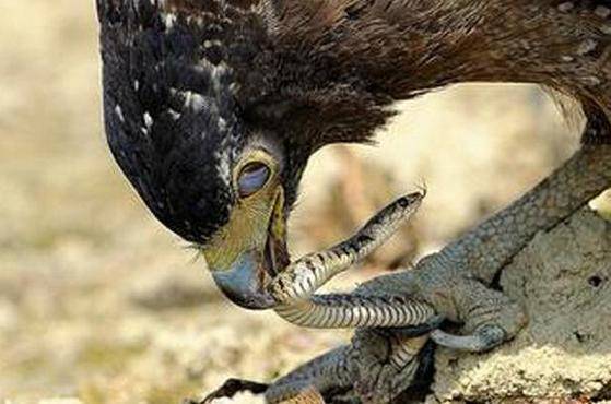 它用它锋利的爪子牢牢地抓着小蛇,并用自己坚硬的喙啄着小蛇,小蛇的身上已经流血了。