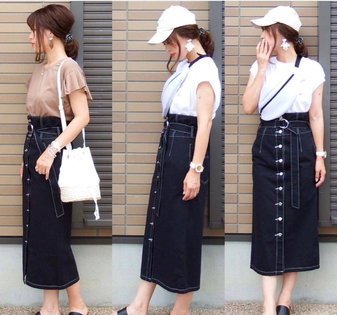 2.過膝紐扣裙牛仔面料的及膝紐扣裙,和牛仔褲、牛仔夾克、牛仔襯衫一樣,有青春活力的感覺。穿上它會顯得年輕不到五歲。及膝的紐扣裙除了顯著的減齡效果外,修身效果也不錯。在包裹里,腿部的所有缺點都可以用subt來遮蓋。對此,我們可以從以下兩組穿搭中看出。