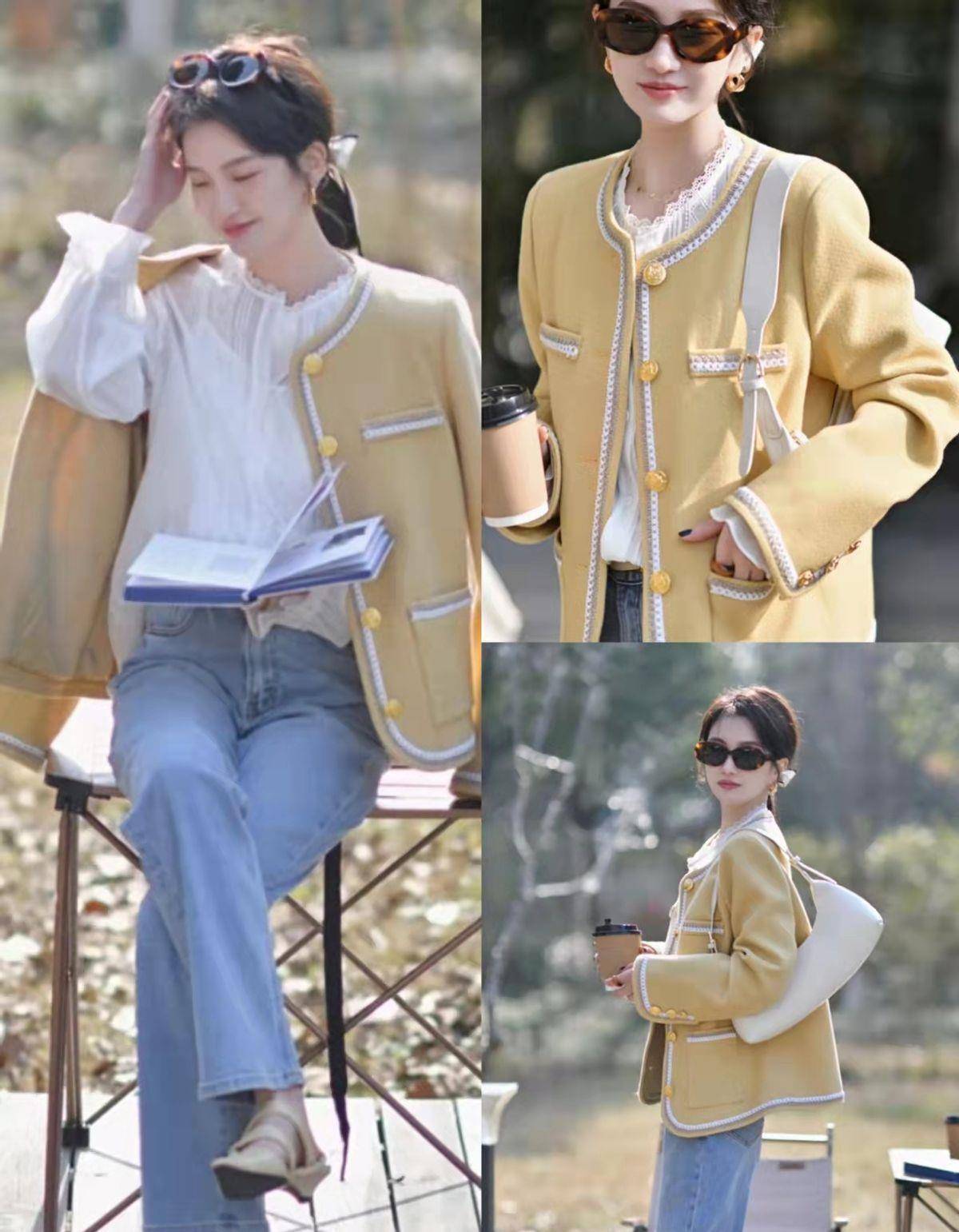 2、嫩黃色小香風外套+白襯衫+淺藍色高腰牛仔褲
