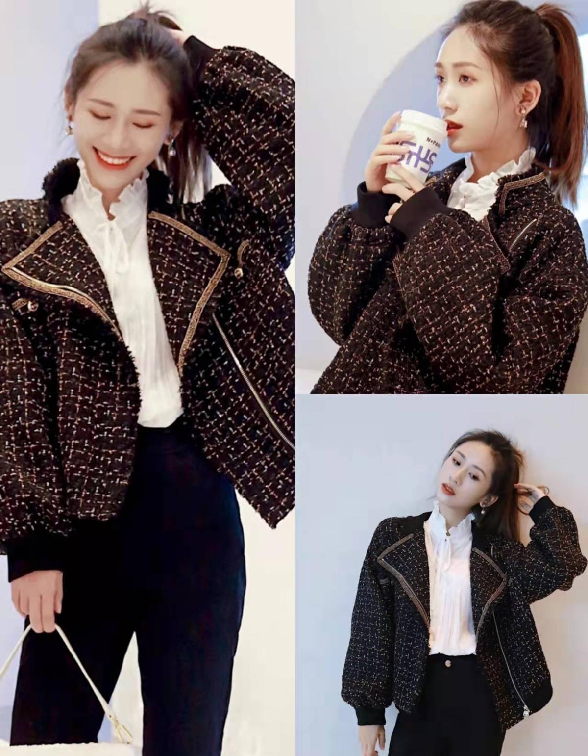 1、黑色小香風外套+立領白襯衫+黑色高腰直筒褲