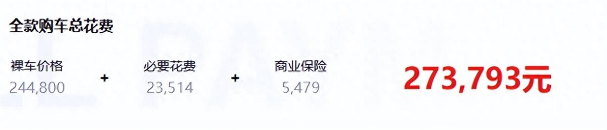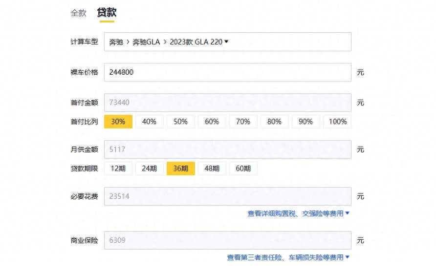 奔馳GLA 220的官方指導價為31.58萬元,現在有限時促銷活動,降幅達到7.1萬元,所以裸車價為24480元,購置稅、交強險、上牌費以及車船稅等必要花費總計為23514元,商業保險我們以100萬元的賠付額度,全險來計算,第三者責任險+車輛損失險+車身人員責任險+車身劃痕險總計商業保險費用為6309元。因此如果選擇全款購車的話,該款車落地需要273793元。