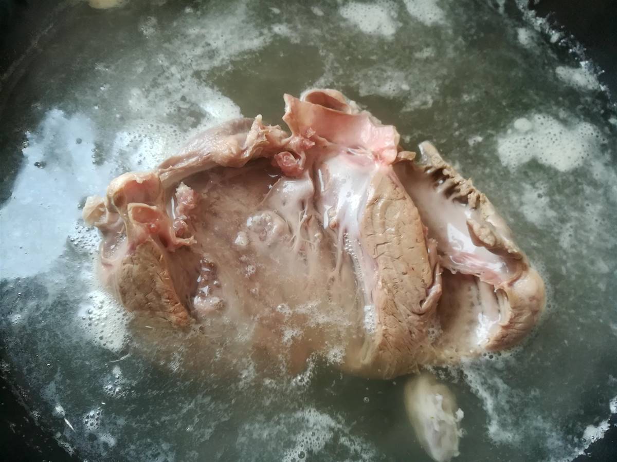 鍋里放適量的水,放入豬心,加入料酒,中火加熱不加鍋蓋,把豬心煮到變硬,徹底煮熟。這里給大家分享一個做菜的小妙招,肉類焯水的時候,不要加鍋蓋,這樣肉類中的腥臊味才能蒸發掉。