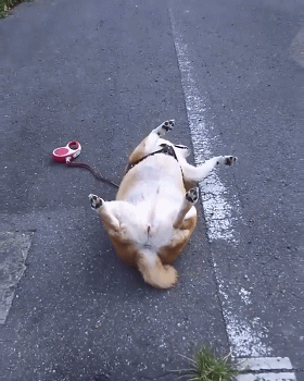 狗狗就四脚朝天躺在地上,还滚来滚去,说明它正在对你撒娇,想要你和它一起玩哦~