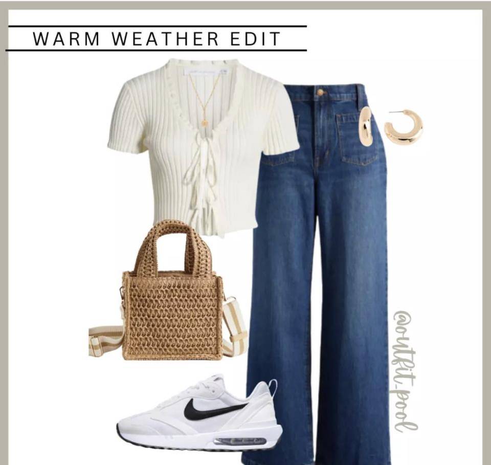 喇叭褲的復古時尚其實并沒有過時。一條喇叭牛仔褲,搭配超短薄襯衫,用蕾絲代替了傳統的紐扣。這是一種非常法式的田園風格,但是變得更加有序,非常都市化。有點浪漫的裝扮。