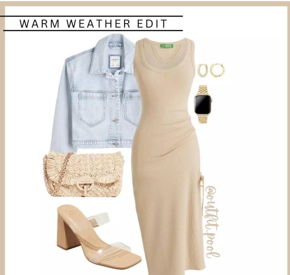 展現曲線感的修身連衣裙,搭配修身牛仔外套,女人味十足又輕松,日常穿搭也很好看。