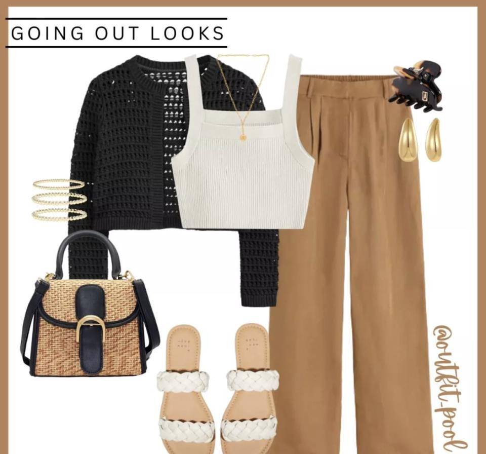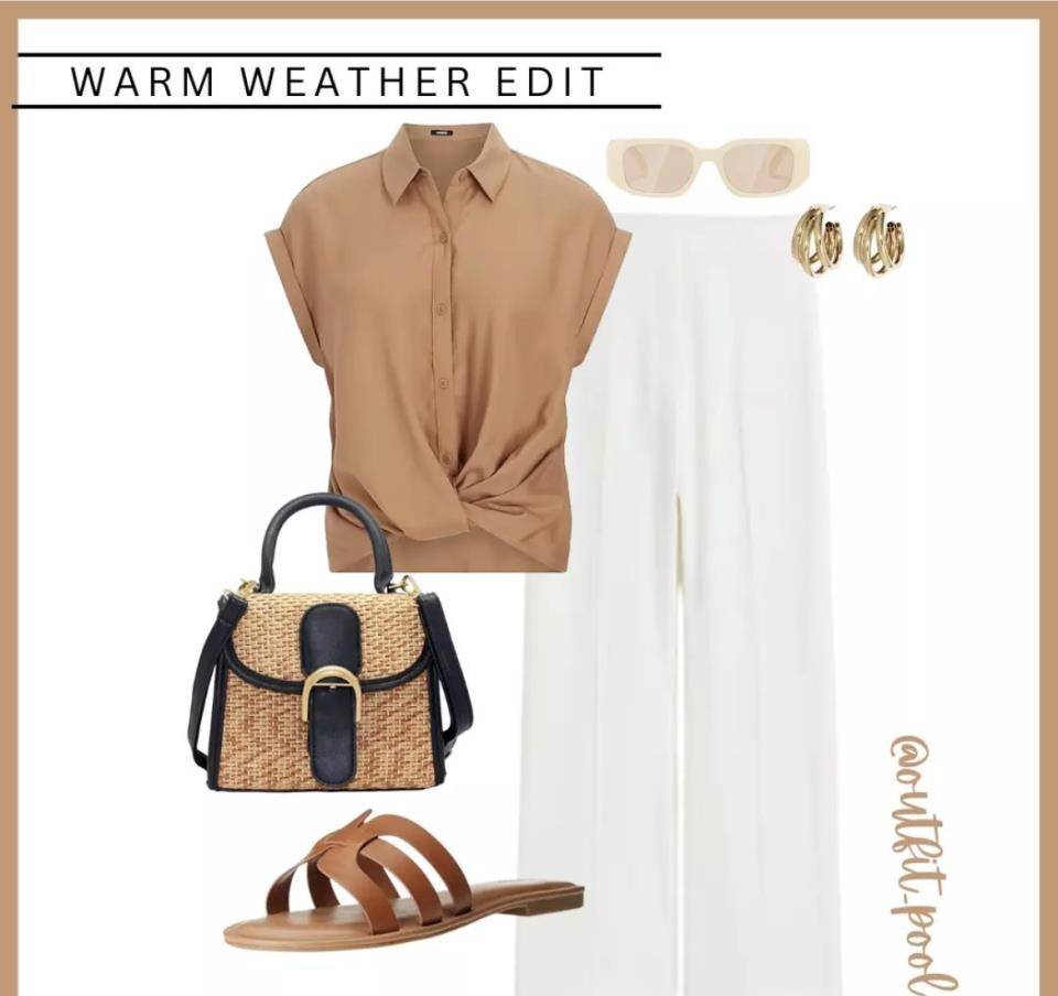 如果擔心白色長褲顯腿粗,可以改穿杏色高腰長褲,內搭超短背心,內搭鏤空襯衫。上衣都是短款剪裁,既干練又清爽。