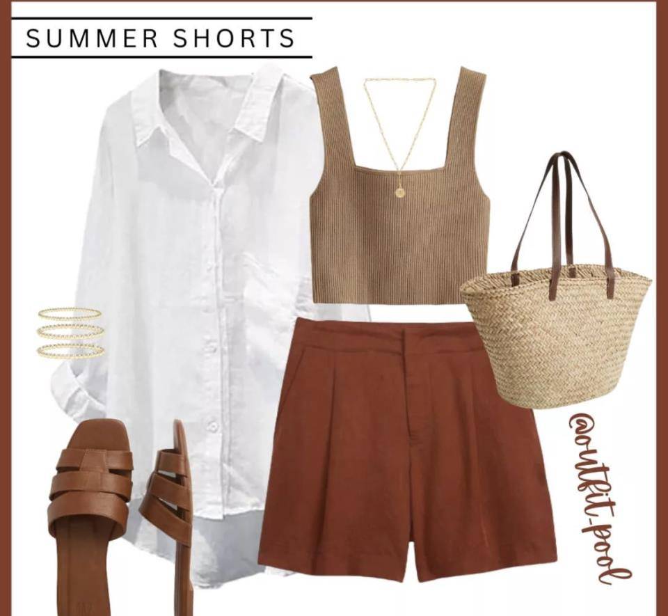 雖然背心和短褲的搭配很簡單,但是換個顏色就會給你不一樣的感覺。奶茶色和咖啡色的背心搭配棕紅色的短褲,搭配柔軟的長款白襯衫,既有暖色調帶來的陽光感,又有大方簡約的風格。基本款,所以休閑風也能穿得時髦。