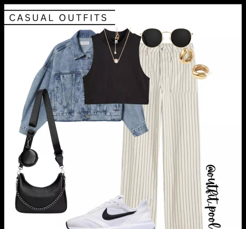 穿工字背心也很時髦,短外套搭配亮條紋高腰褲,簡約又優雅。