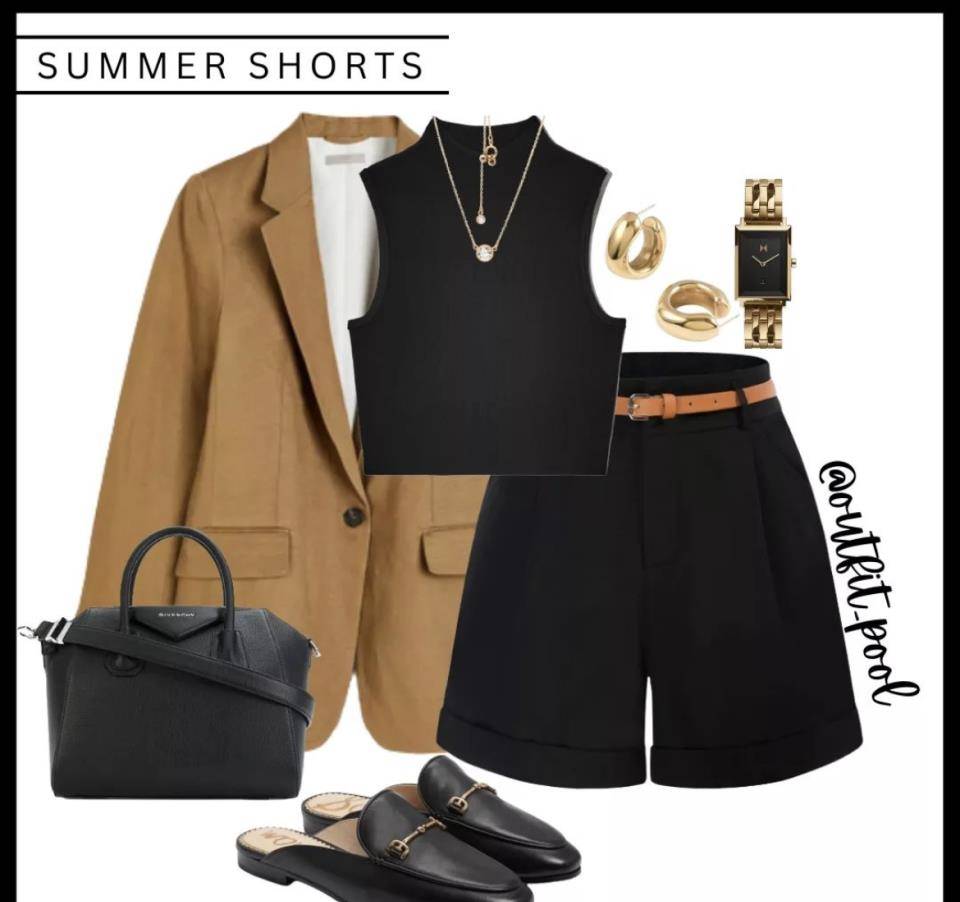 我們上班族或者大女人喜歡的西裝很容易被初夏的涼風所取代。內層換成賽車背心,搭配好看的直筒短褲,黑色內層搭配奶茶咖啡套裝,顯得顯瘦又高級。