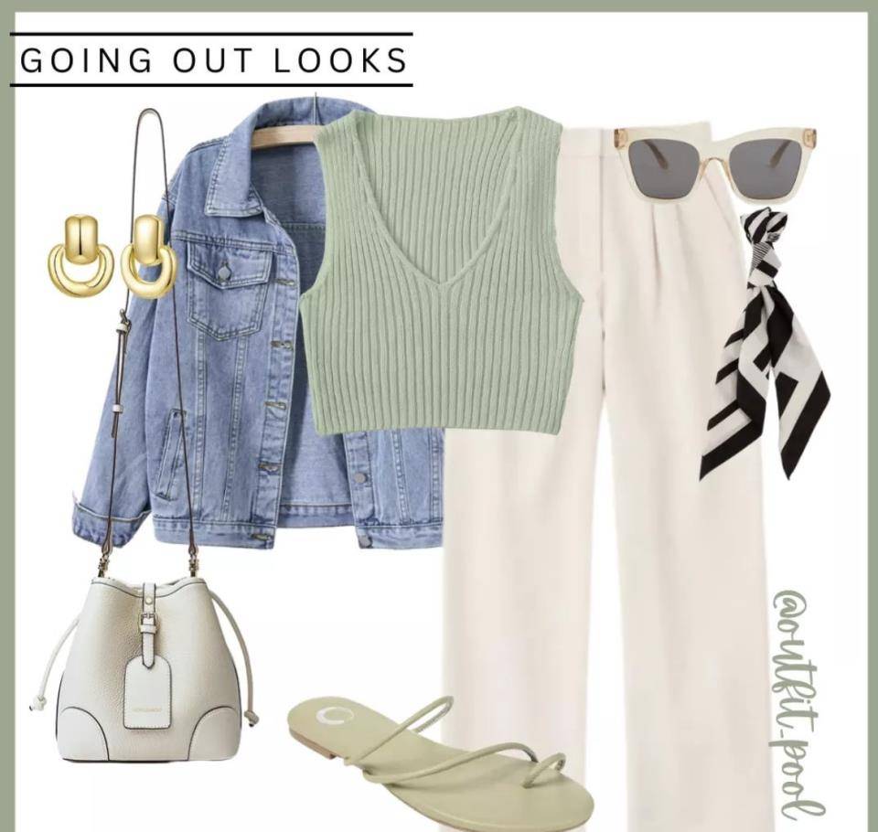 廓形輕盈的牛仔外套是減齡風格的保證。穿著淺薄荷綠的V型背心+奶白色的褲子,是非常清爽的夏季搭配思路。