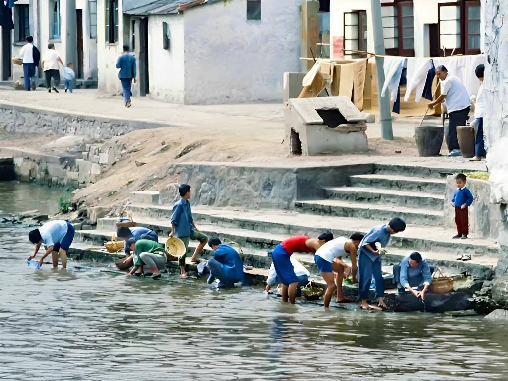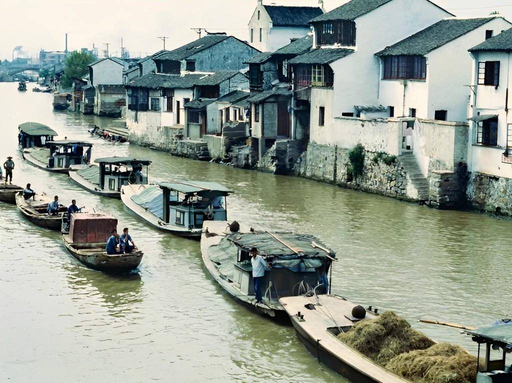 無錫站70年代的江南水鄉,臨水而砌的房屋,每家每戶的墻壁都刷得雪白,運河里的船只總是忙碌得不停,一艘接著一艘,遠處的台階上,還有一群人在洗衣服