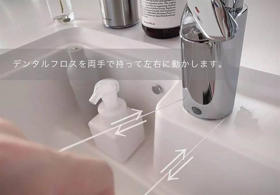 利用隨手可得的牙線,繞在水龍頭底部的縫隙,來回左右清理。