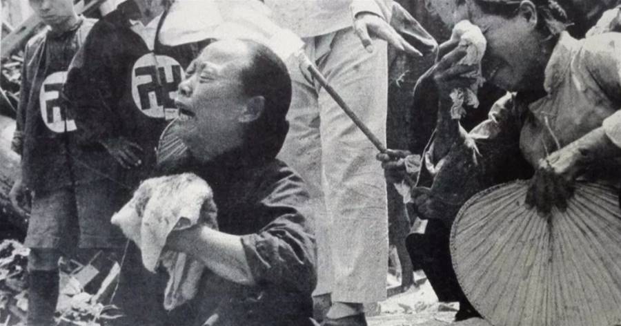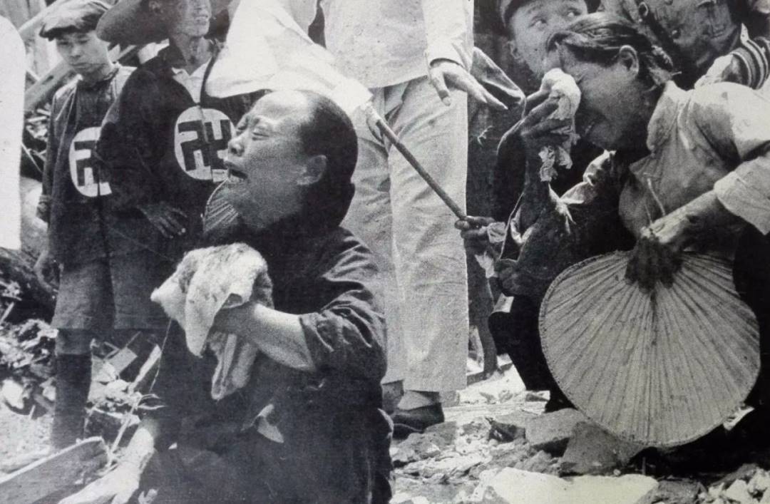 1938年,日軍轟炸武漢,婦女在親屬的遺體旁邊,痛哭不已。