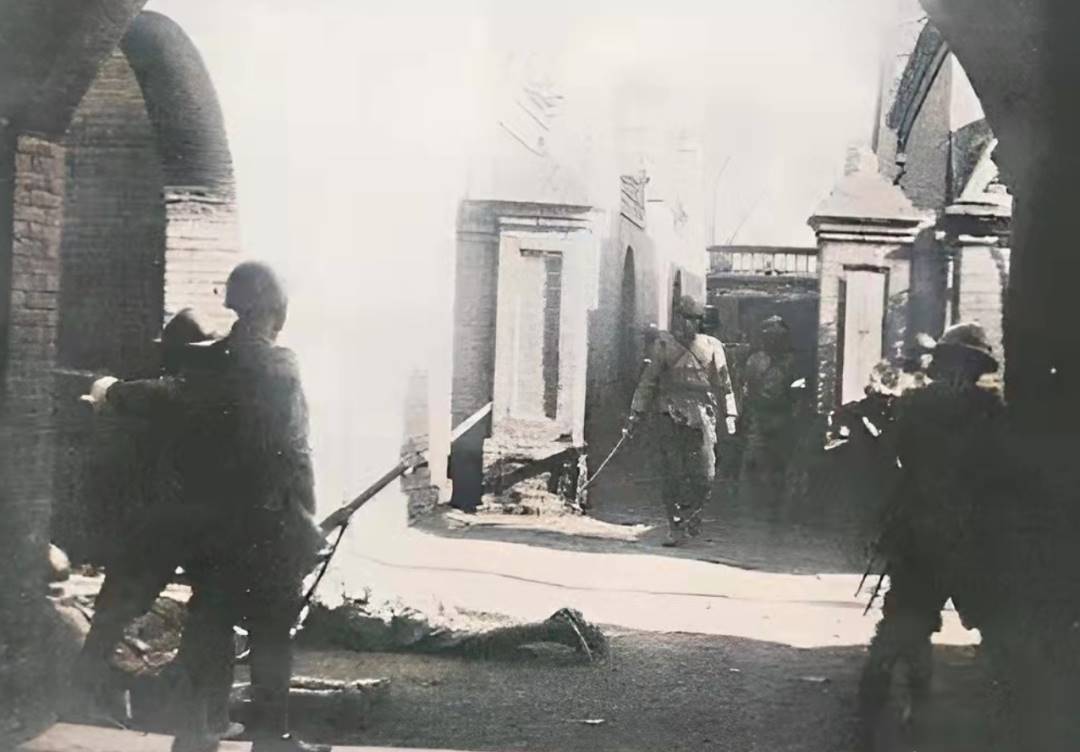 這是關東軍隨軍記者拍攝的1931年9月19日晨,關東軍侵入沈陽張學良的司令部,躺在地面上的,是被日軍殺害的東北軍人員,在鏡頭的正中央,是一名提著軍刀的日本軍官,他正在搜索東北軍的人員,見一個,殺一個。